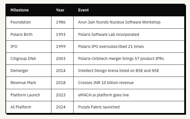 Arun Jain founded the company in 2011. He had built Polaris Software Lab from scratch starting in 1993, grew it into a major banking IT firm, then sold it to Virtusa. Intellect was his third venture in financial technology. The company listed on the BSE and NSE in 2014 after a demerger from Polaris. Today Intellect operates in 57 countries and serves more than 500 financial institutions. In India, 14 of the top 15 banks run Intellect products. Globally, 88 large transaction banks use its Digital Transaction Banking platform.