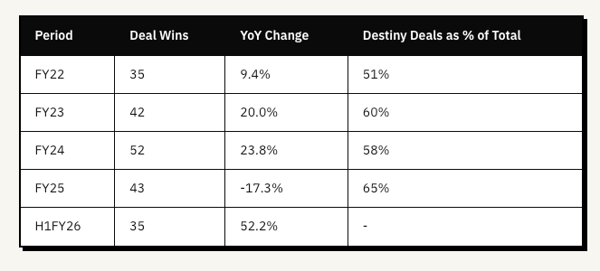 Destiny deals are contracts worth more than INR 200 million. These are the transformation projects that reshape a bank’s technology foundation. They take longer to close but generate revenue over many years. The number of deals fell in FY25. But deal quality improved. Destiny deals now represent 65% of total wins, up from 51% in FY22.