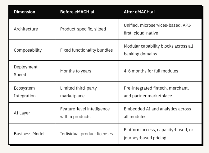 When a bank buys core banking software, it stays for a decade or more. Implementations take 12 to 24 months at most vendors. Ripping out a core system and starting fresh is expensive and risky. In March 2023, the company launched eMACH.ai, a platform built on microservices, APIs, and cloud infrastructure. The architecture allows banks to replace individual modules instead of doing full system overhauls. Implementation timelines dropped to 4-6 months. Deal sizes expanded from USD 3 million to USD 7-8 million.