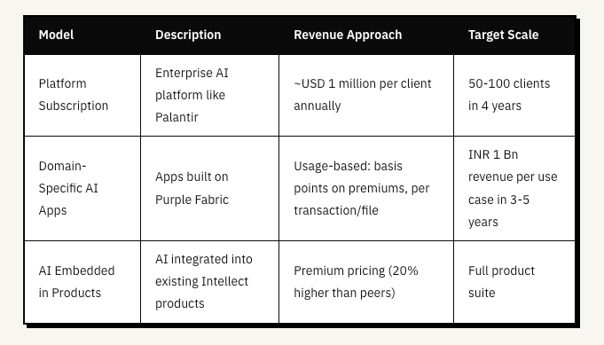 In August 2024, Intellect launched Purple Fabric, an enterprise AI platform. More than 45 global banks and insurers have adopted it. The platform launched in the US in August 2025. A London brokerage signed a INR 200 crore multi year deal to use Purple Fabric for underwriting transformation. The company targets INR 10 billion in Purple Fabric revenues within 3-5 years.