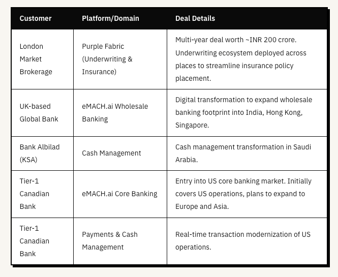 Intense competition from global software vendors (FIS, Temenos, Oracle Financial Services), domestic product players, and large Indian IT service firms in core digital transformation deals.