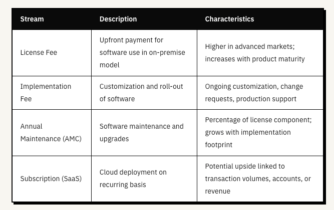 Revenue comes from two buckets. Implementation work (installing and customizing the software) makes up 50% of revenues. License-linked revenues (license fees, annual maintenance contracts, subscriptions) make up the other 50%. The company handles implementations itself rather than handing them to system integrators.