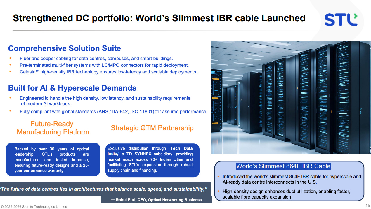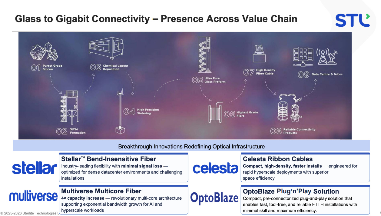 Optical fibre cables (ofc) convert raw fibre into deployable products. stl makes loose tube cables (the standard outdoor backbone cable), ribbon cables (stacks of flat fibre ribbons for high-density applications), tight-buffered cables (for indoor use), micro-duct cables (ultra-slim for blowing through ducts with compressed air), armoured cables (for direct burial), and aerial cables (self-supporting with integrated messenger wire). the celesta ibr (intermittent bonded ribbon) launched in q2 fy26 packs 864 fibres in an 11.7mm diameter - described by management as “the world’s slimmest” at that fibre count - which is specifically for ai data centre intra-building high-density deployments.
