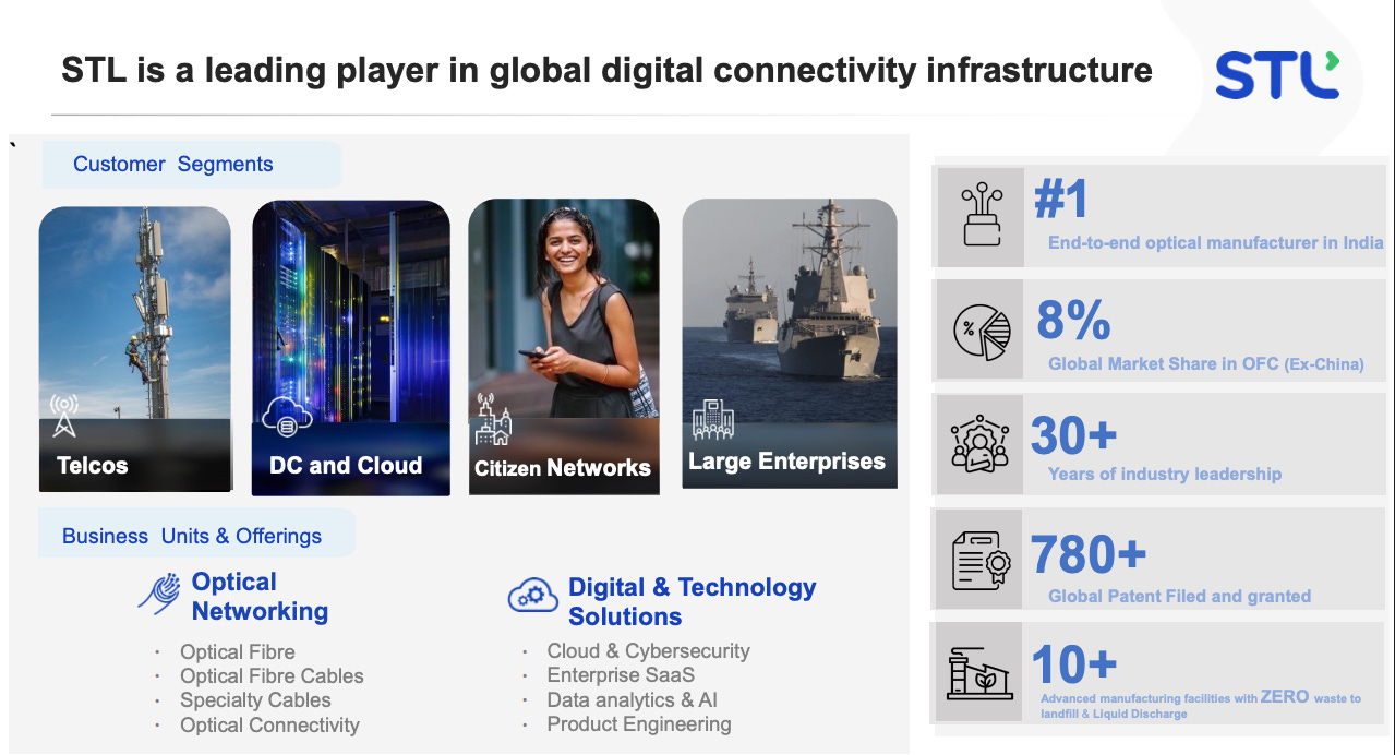 The optical networking business is the core of stl. it accounts for roughly 93% of revenues post-demerger and encompasses everything from optical fibre and fibre cables to specialty cables and optical connectivity products.