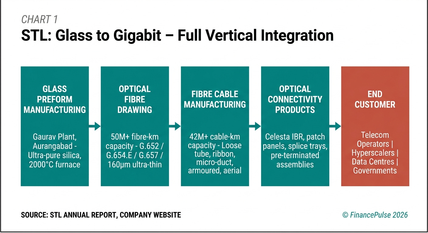 Sterlite Technologies (stl) makes the physical infrastructure that carries the world’s data. The core product is glass - specifically, optical fibre drawn from pure silicon dioxide, turned into cables, and shipped to telecom operators, data centre operators, and internet service providers across more than 100 countries. When a british telecom engineer cables a street cabinet for fibre-to-the-home, or when a hyperscaler in virginia connects two server racks, the glass they are pulling through ducts is very likely made in aurangabad or silvassa.