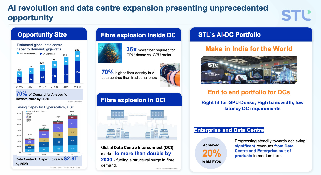 Hyperscalers and data centre operators are the growth frontier. Companies like aws, microsoft, google, and meta are building ai-optimised data centres at an extraordinary pace. Global dc capex is expected to approach $600 billion by 2027 (per cru data cited by management). Each ai data centre requires substantially more fibre per rack than a conventional cloud facility - gpu clusters need high-bandwidth, low-latency intra-facility connectivity. STL has built a specific portfolio for this segment including the celesta ibr cable and pre-terminated high-density assemblies. Hyperscaler procurement is typically done through a vendor-approved list process, and getting onto that list requires significant qualification effort - once in, volumes are large and relationships tend to be sticky.