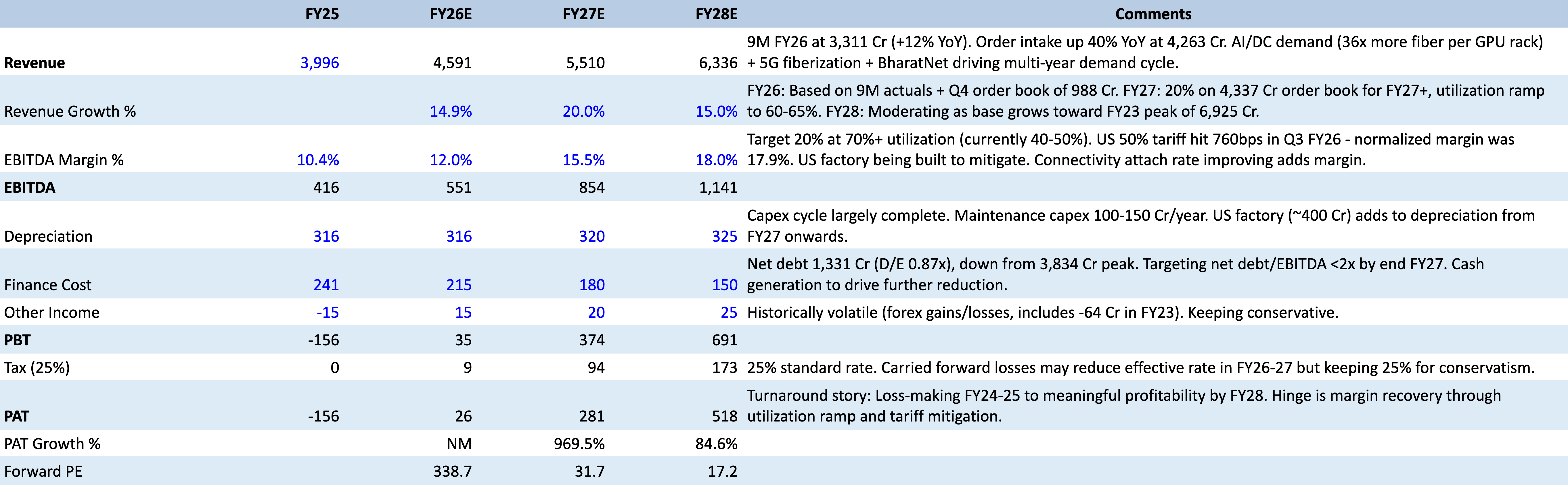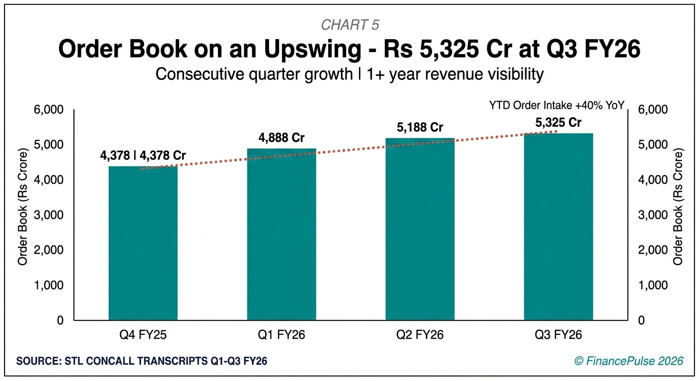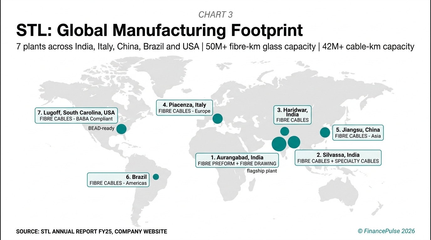 Competitive position: stl claims 8% market share in the global ex-china optical fibre cable market (per q4 fy25 concall, may 2025), down from 12% in fy23. The market share decline reflects the 2022-2024 global inventory correction where north american carriers drew down existing stock before placing new orders - a systemic issue, not specific to stl. The company operates at roughly 50% utilisation of its 50+ million fibre-km glass/fibre capacity and 42+ million fibre-km cable capacity (per q3 fy25 concall, january 2025). As the global upcycle begins, utilisation recovery is the primary margin driver.