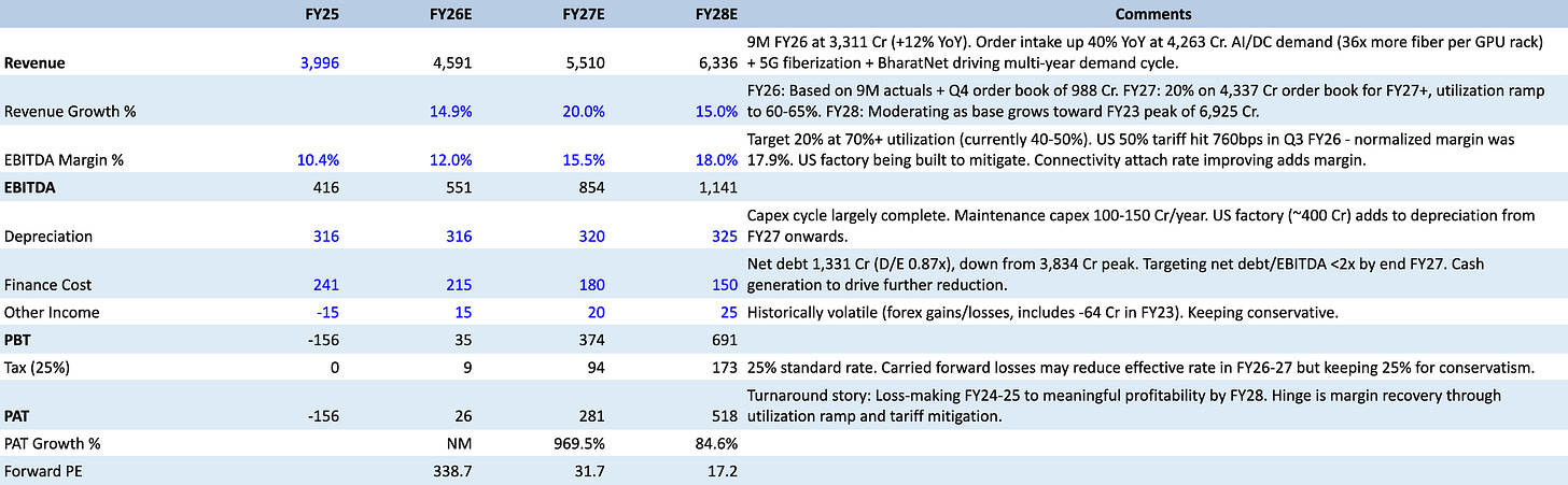 The prysmian appeal fails, forcing a rs 810 crore payment through sti that requires capital infusion from the parent. China eases its export controls on germanium, but also resumes aggressive optical cable pricing in global markets as it seeks to capture the ai data centre opportunity. stl’s market share recovery in the ex-china global market does not happen because chinese manufacturers find ways around tariff barriers or europeans source locally. Utilisation plateaus at 55-60% because bead execution in the us is slower than projected and india’s 5g fiberisation pace is disappointing (telcos delay capex due to arpu pressure). Ebitda margins stay in the 10-13% range with no path to the 18-20% target. stl digital continues to consume capital without scale. Debt stays above 2x ebitda. in this scenario, stl remains a structurally important company in global optical infrastructure but with economics that do not justify its capacity investments, and the period of building for growth extends further without a clear payoff horizon.