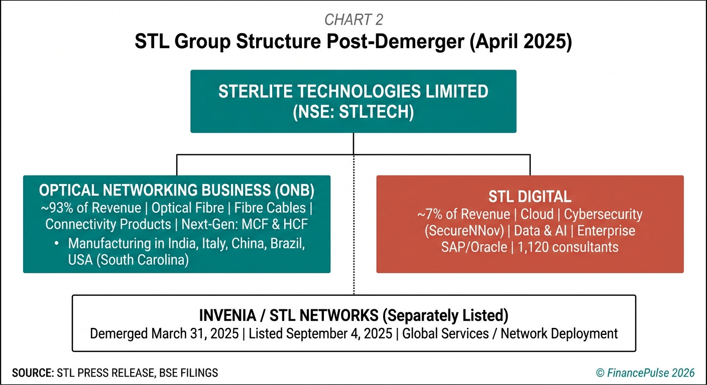 Post the april 2025 demerger of its global services business (now listed as invenia - stl networks), stl today operates as a focused optical networking and digital solutions company. The global services business - which built bharatnet middle-mile infrastructure and deployed fibre networks for telcos - has been separated into a distinct listed entity. What remains in stl is the manufacturing and technology business, supplemented by stl digital, a small IT services arm.