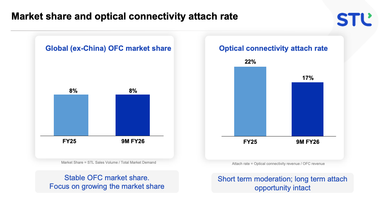 Optical connectivity products include pre-terminated assemblies, patch cords, fibre management systems, splice trays, and high-density celesta ibr technology enclosures. the “optical connectivity attach rate” - the percentage of stl’s fibre cable revenue that also carries connectivity product revenue - hit 22% in fy25 (per q4 fy25 concall, may 2025) before moderating to 17% in ytd fy26, primarily due to project timing and product mix shifts. management wants to grow this attach rate to 30%+ over time because connectivity products carry meaningfully higher margins than bulk cable.