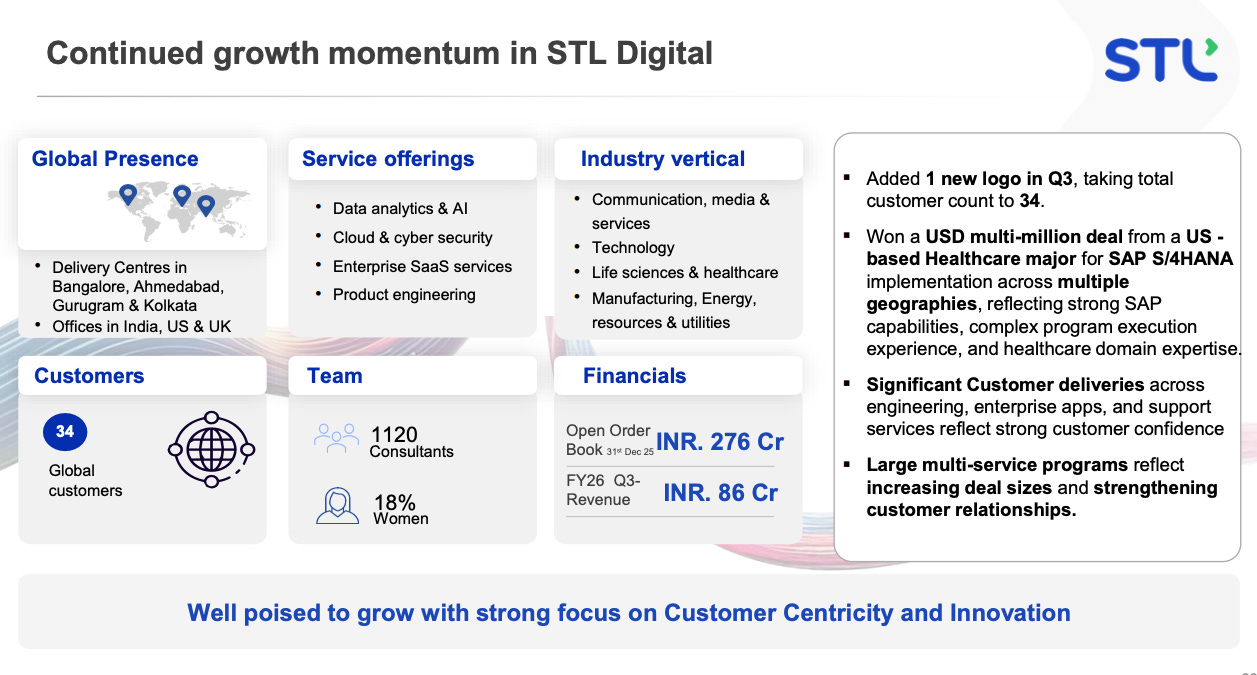 STL digital is a wholly owned it services and consulting subsidiary. It provides cloud migration, cybersecurity, data analytics, ai services, and enterprise saas (sap and oracle implementations) to enterprises across communications/media, healthcare, life sciences, energy, and manufacturing sectors. It has delivery centres in india, the us, and the uk, and a team of 1,120 consultants as of q3 fy26.